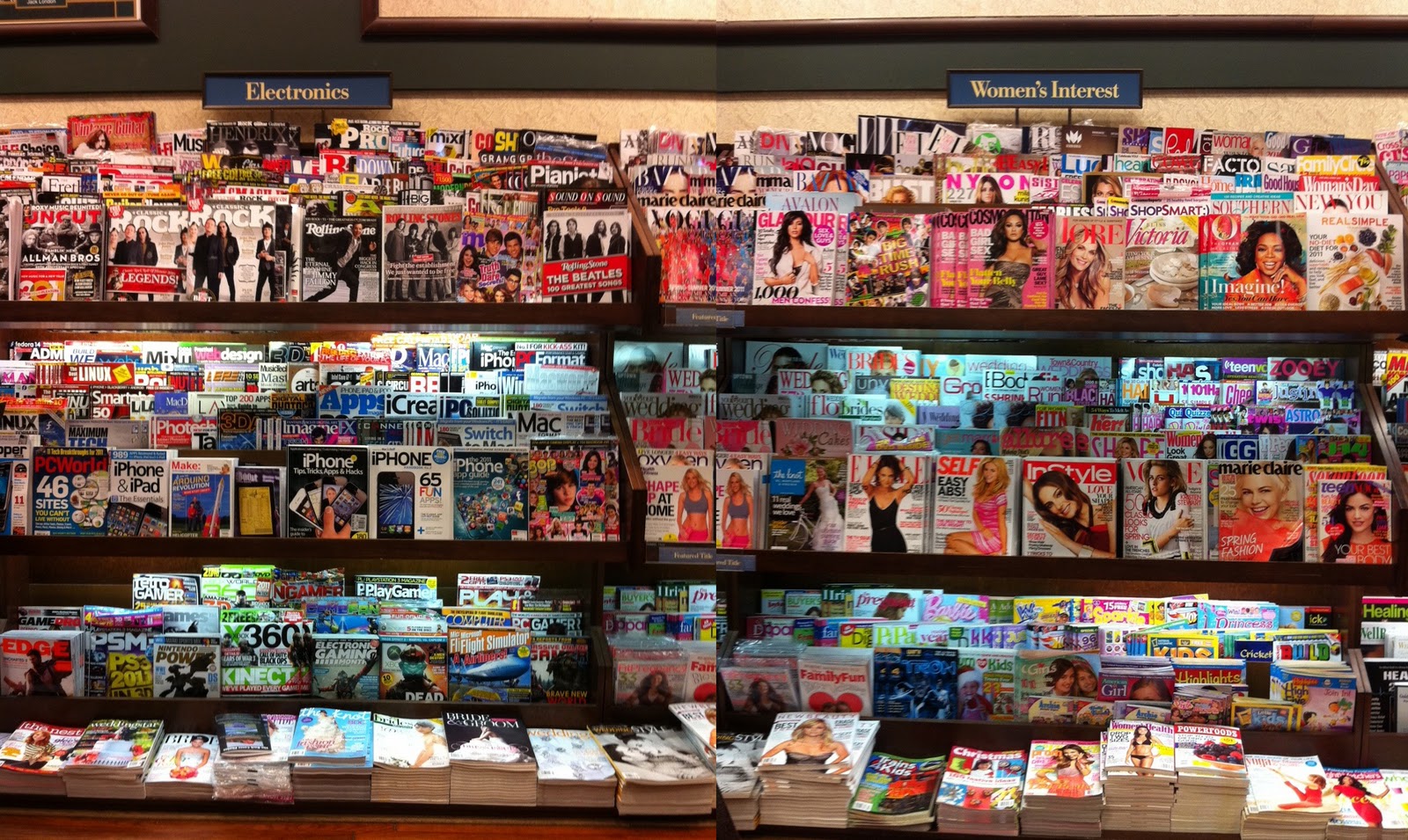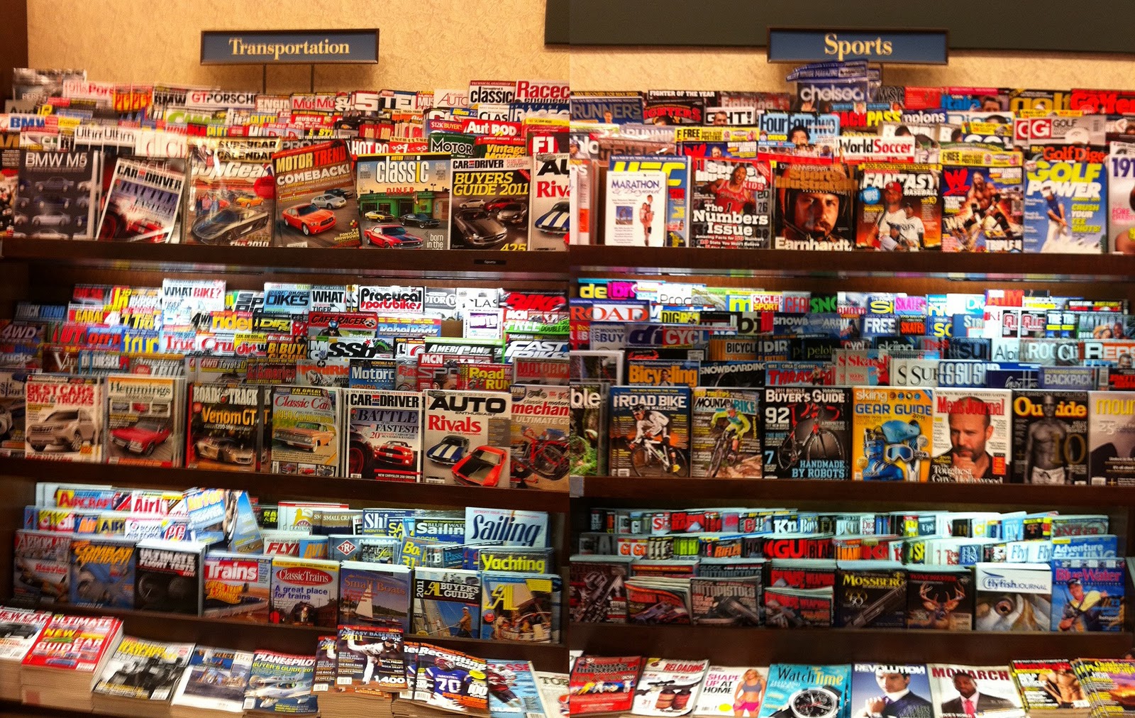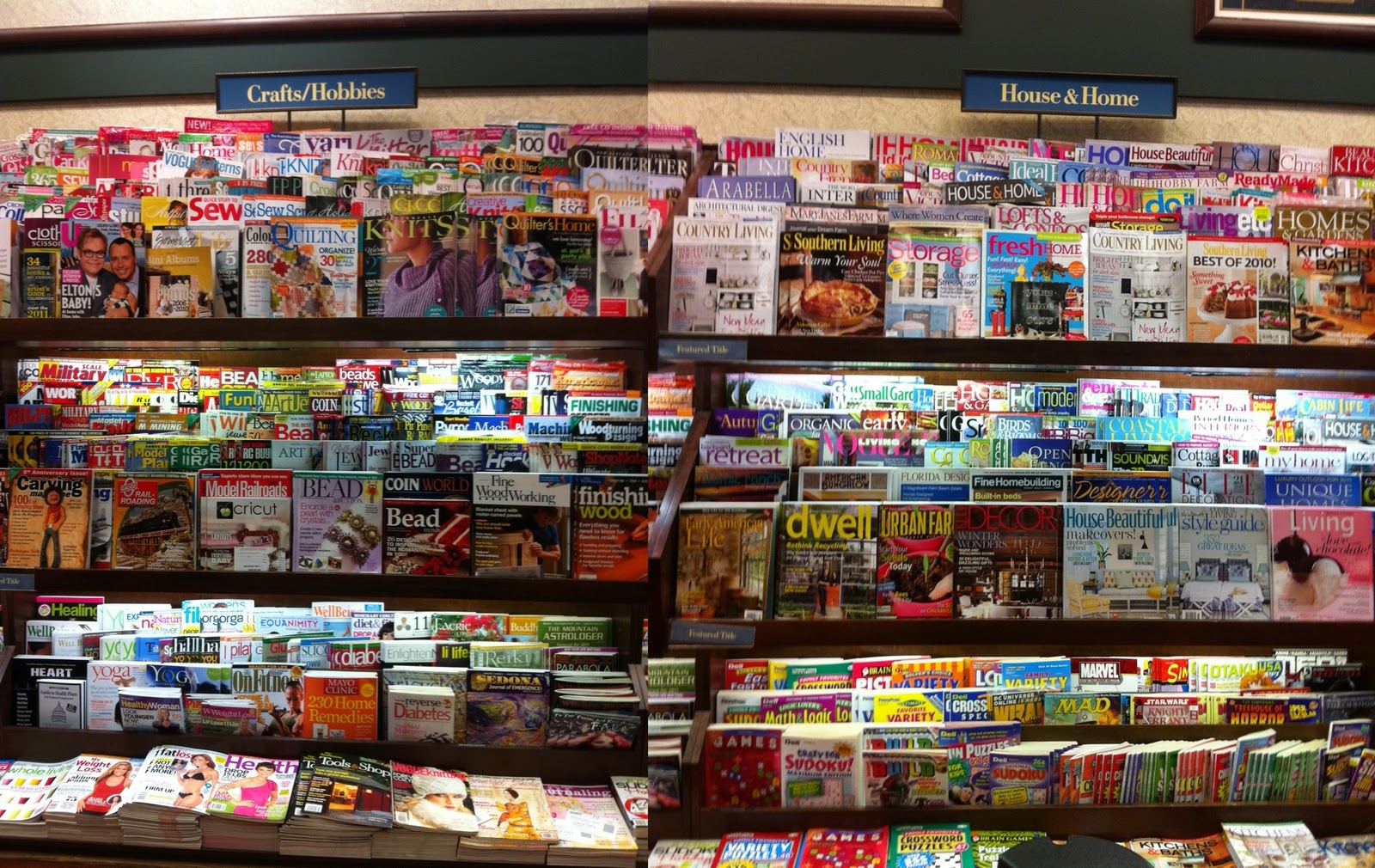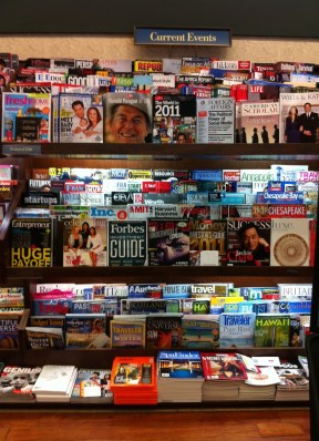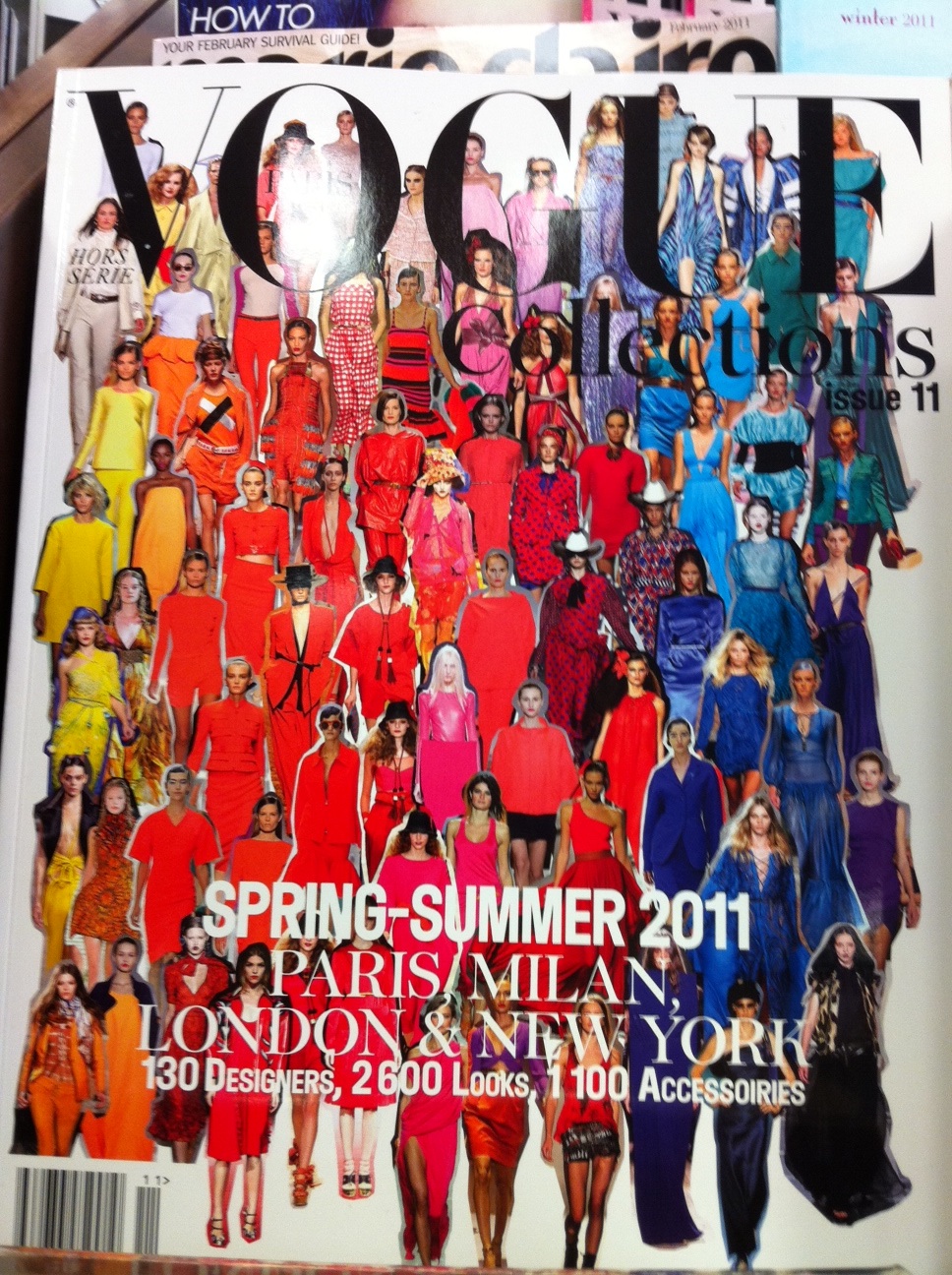 Before leaving the periodicals section of the store, I took a moment to observe the myriad of different titles Barnes & Noble carried and how they chose to categorize them. An official count wasn’t conducted, but it’s safe to guess that there were at least 200 different journals lining the shelves. There seems to be a print medium catering to every niche market from cooking and cars to finance and fashion, and as a journalist, I definitely took a moment to consider that despite the bleak outlook for print media, it’s apparently booming in the magazine realm. I took a few minutes and photographed each section (the only one missing is “Men’s Interest” – the image was too blurry to upload). The last picture is an image of Vogue‘s Spring-Summer 2011 Collections issue which initially caught my eye when I arrived.