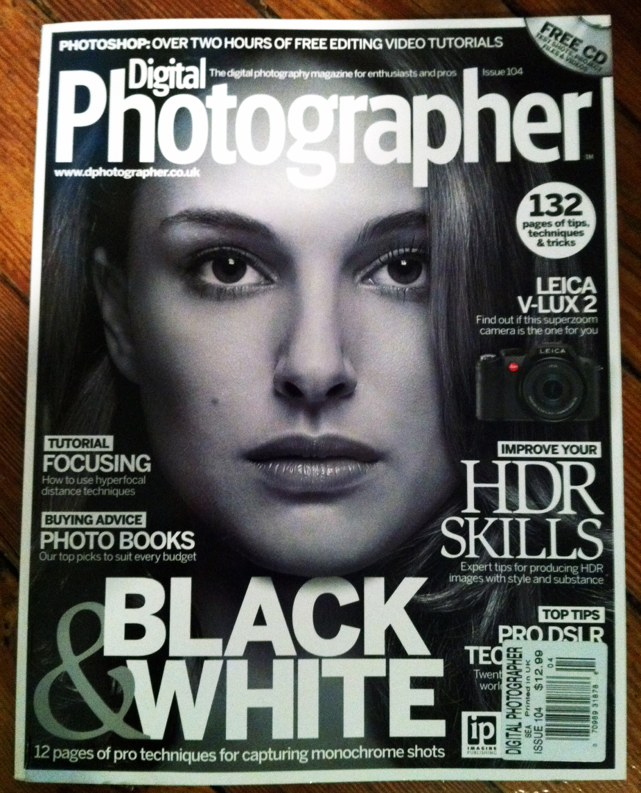 While there, I also bought a copy of Digital Photographer (Issue #104), which I thought would come in handy with my new P104 Class “Digital Photographic Production.” It comes with “Over two hours of free editing video tutorials” for Photoshop. This month’s ‘It Girl’, Natalie Portman, graces the cover.
