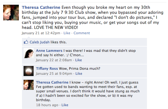 Cyberfans: Technology has made keeping track of your favorite artist/band much easier. Most bands and singer/songwriters have a page on Facebook, MySpace, or Twitter, in addition to their own website. I sign up for mailing lists and fan clubs in person at shows and online in order to get tour updates, special promotions, and other exclusive information (like ticket pre-sale passwords and discounts on “merch”). One of my favorite new bands is She & Him, a collaborative effort of Zooey Deschanel (actress and singer-songwriter) and M. Ward (guitarist and singer-songwriter). They have a Facebook page and at the beginning of last year I “Liked” them and posted several wall messages requesting they play near the DC area. Eventually there tour information became available and to my absolute astonishment (and it would be far-fetched if this were a coincidence), they were booked to play the 9:30 Club on my 30th birthday – a Wednesday – July 7th. Needless to stay, I was elated and immediately purchased tickets.