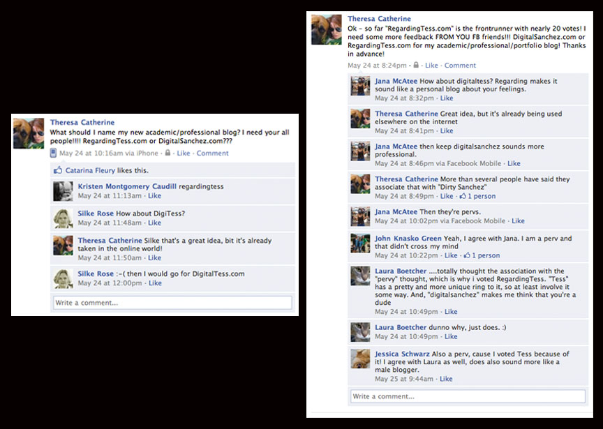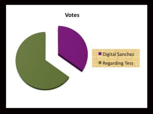 When faced with a difficult decision, however trivial, I turn to my friends and family for advice. I took a 21st-century approach with my question too, using Facebook, Twitter, E-mail, and text messaging. In all, I received 37 responses (24 for “Regarding Tess” and 13 for “Digital Sanchez”).