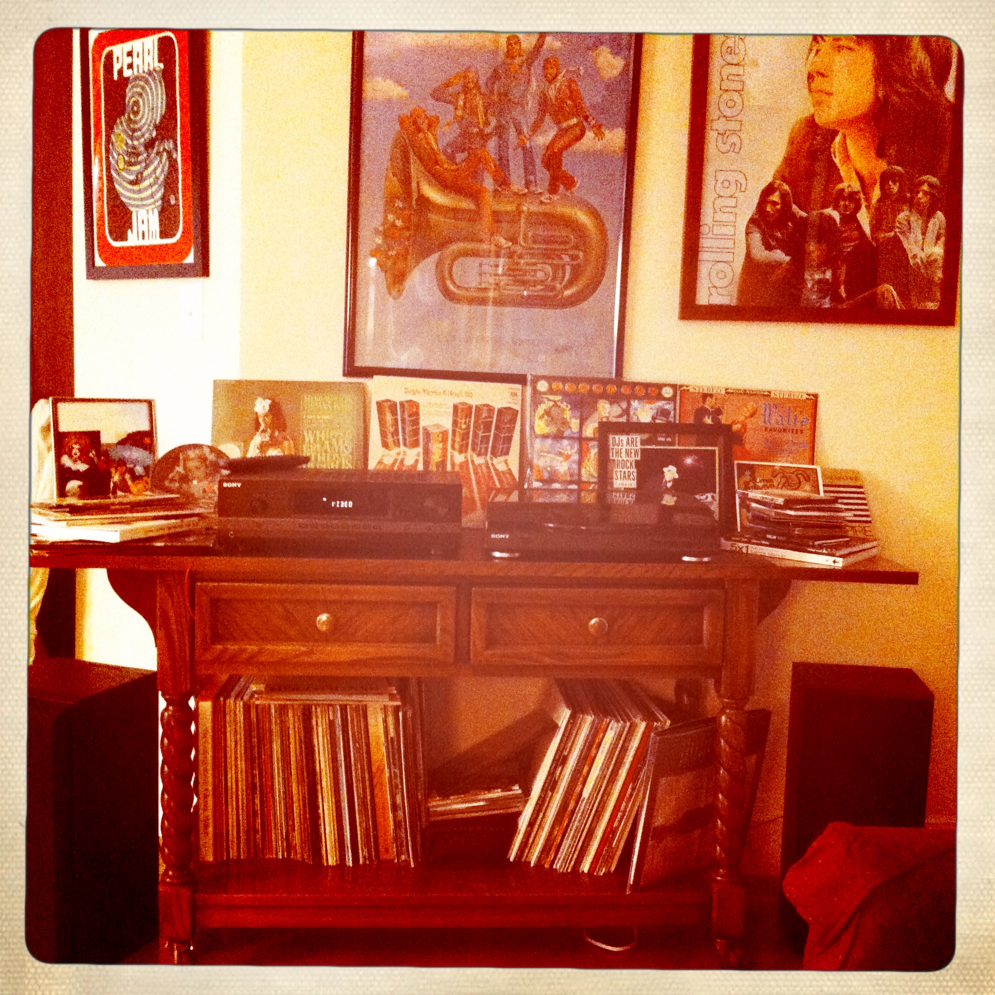 **The bonus fold-out posters above the Sony receiver & record player came from two vintage albums – part of the collection inherited from my parents – 1978’s Peter Frampton & The Bee Gees “Sgt. Pepper’s Lonely Heart Club Band Soundtrack (art by the late Birney Lettick) and 1969’s Rolling Stone’s “Let It Bleed” (poster design Victor Kahn) – which, incidentally, is going for $164 on eBay right now! The Beatles’ “White Album” odd-shaped poster insert will soon be joining these two rare finds once it’s framed.**