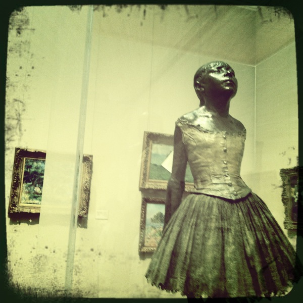 Below is a bronze cast (with satin & gauze) of one of my favorite sculptures: “Little Fourteen-Year-Old Dancer,” aka “La petite danseuse de quatorze ans.” The 3-foot girl was originally executed in wax and cloth circa (1878-82), this is one of 28 editions cast in bronze between 1920-23 after Degas died.